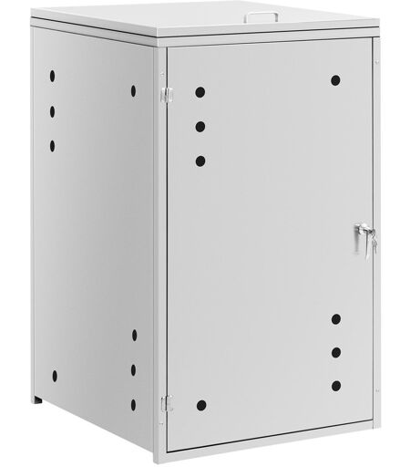 Jeder braucht Mülltonnen für Restmüll, Wertstoffe oder Bioabfälle, doch niemand will sie sehen. In der Mülltonnenbox von Uniprodo findet jede Tonne einen diskreten Platz, der sich dank seines ansprechenden Designs auch sehen lassen kann. Mit Uniprodo finden Sie immer eine saubere Lösung für Ihr Haus, Ihre Werkstatt oder Ihren gastronomischen Betrieb! Die praktische Mülltonnenverkleidung ist funktional wie optisch die perfekte Lösung, um eine Mülltonne mit einem Fassungsvermögen von bis zu 240 l zu verbergen und bei Bedarf einen mühelosen Zugang zur Tonne zu gewähren. Ob am Gartenrand, an der Garage oder im Innenhof eines Gebäudekomplexes, die Mülleimerbox bietet einen perfekten Ort, um den Abfalleimer sicher wie unauffällig abzustellen. Die Mülltonnenbox aus 0,7 mm starkem Edelstahl verwahrt Ihre Tonne im Außenbereich sicher und zuverlässig. Das wetterfeste Material ist darüber hinaus besonders pflegeleicht, sodass Sie den Müllraum mühelos in einem hygienischen Zustand halten. Dazu tragen auch die Luftlöcher bei, die eine optimale Innenbelüftung sicherstellen. Ob Sie die Mülltonne für Biomüll, Restmüll oder Papier in dem Fach unterbringen, bleibt ganz Ihnen überlassen. Mit einem stabilen Schloss verschließen Sie sicher die Tür der Mülltonnenbox aus Metall. Damit verhindern Sie, dass Wildtiere an den Inhalt gelangen oder unbefugte Personen Abfall in Ihrer Mülltonne entsorgen. Die Tür öffnen und schließen Sie mühelos. Die Box ist mit einem Deckel versehen, den eine Gasdruckfeder offen hält. Das erleichtert Ihnen den Zugriff auf den Müllbehälter deutlich, da Sie ihn zum Befüllen nicht jedes Mal herausziehen und wieder hineinschieben müssen. ...