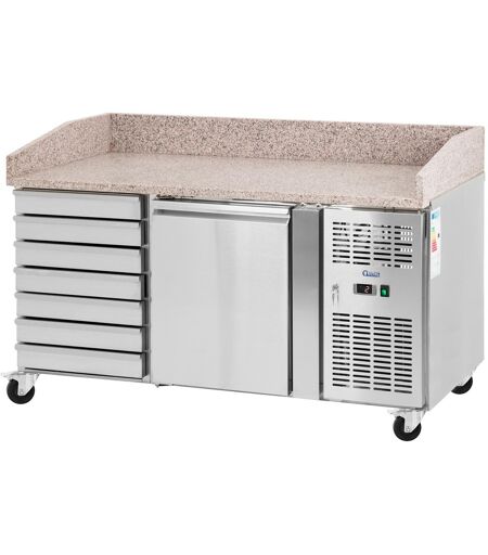 Der Kühltisch von Royal Catering sorgt für frische Lebensmittel zum schnellen Weiterverarbeiten. Das große Fassungsvermögen von 165 l ist einer der Hauptvorteile dieses Modells. Unter der Arbeitsfläche aus Granit finden Sie sieben Schubladen sowie ein geräumiges Kühlfach, das Sie mit einem höhenverstellbaren Einlegerost unterteilen. Der sanfte Öffnungs- und Schließmechanismus der zwei Schwenktüren erleichtert die Handhabung im hektischen Alltag, gerade wenn Sie keine Hand frei haben. Der Pizzakühltisch punktet mit einem Temperaturbereich von 2 - 8 °C. Die Einstellung erfolgt intuitiv über ein elektronisches Display, welches Ihnen stets den aktuellen Status des Gerätes anzeigt. Mit dem Kühltisch lagern Sie Ihre Produkte bei der richtigen Temperatur und bereiten Sie direkt auf der 151 x 80 cm großen Platte aus Granit zu. Das Modell arbeitet dank starker Isolierung und des klimaschonenden Kühlmittels R290 sehr sparsam. Die Tür zum Kühlsystem ist abschließbar. Zudem verfügt der Kühltresen über eine automatische Abtaufunktion, die Stromkosten und Arbeitszeit reduziert. Der Kühltresen überzeugt so durch die Energieeffizienzklasse B. Das professionelle Kühlgerät besitzt sechs Schwerlastrollen, die auch auf unebenen Böden geschmeidig laufen. Mit zwei Feststellbremsen blockieren Sie die Räder, sobald der Kühltresen am gewünschten Ort steht. Das Gehäuse des Kühltisches besteht aus hochwertigem Edelstahl. Dieses Material ist biologisch inert, sodass es bei Kontakt mit Lebensmitteln nicht reagiert und daher gesundheitlich unbedenklich ist. Daneben ist es leicht zu reinigen, robust und unempfindlich gegenüber Korrosion. ...