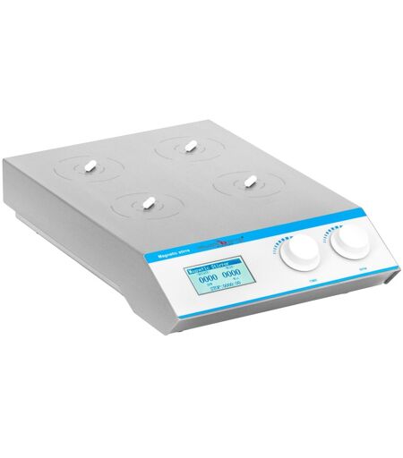 Verrühren Sie Flüssigkeiten mit dem Magnetrührer so flexibel und präzise wie nie zuvor in Ihrem Labor. Nutzen Sie vier Stellflächen für ebenso viele Glasbehälter mit einem Fassungsvermögen von jeweils bis zu 1000 ml, um parallel Flüssigkeiten zu vermengen. Der Rührfisch kann auch in geschlossenen Behältern zum Rotieren gebracht werden und ermöglicht das Verrühren von Flüssigkeiten, ohne direkt mit der flüssigen Substanz in Kontakt zu kommen. Die Rührplatte ist mit einer Anti-Rusch-Beschichtung versehen, die zudem Kratzer und Korrosion verhindert. Als ebenso langlebig und pflegeleicht erweist sich das Edelstahlgehäuse. Die Drehgeschwindigkeit sowie die Dauer regeln Sie über ein übersichtliches Bedienfeld mit LC-Display. Zwei Drehregler erlauben eine genaue Justierung der gewünschten Werte. Die Drehgeschwindigkeit wählen Sie zwischen 200 und 2200 U/min. So erzielen Sie präzise Mischergebnisse, die Sie jederzeit wiederholen können. Die Betriebsdauer stellen Sie mit dem Timer auf 0 - 9999 min ein. Die eingestellten Werte gelten für alle vier Stellflächen. Dank der Gummifüße überzeugt der magnetische Rührer selbst bei hohen Drehgeschwindigkeiten mit einer hohen Standfestigkeit. ...