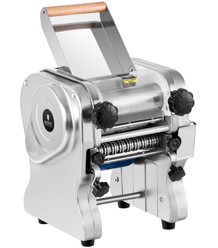 Ob im Restaurant, in der Trattoria oder der heimischen Küche: Die universelle Nudelmaschine RC- EPM160 von Royal Catering, den Experten für hochwertige Küchengeräte, ist der unverzichtbare Helfer, um schnell verschiedene Pastasorten zu zaubern. Beschleunigen Sie die Arbeitsabläufe in Ihrem Betrieb und sparen Sie dadurch wertvolle Zeit und somit Geld. Mit der elektrischen Nudelmaschine gehört kräftezehrendes Teigauswalzen per Hand der Vergangenheit an. Der Teigeinzug der Nudelteigmaschine ist 16 cm breit. Bestreuen Sie den Teig mit Mehl, damit er nicht an den Rollen anhaftet oder gar reißt, und drehen Sie die Masse erneut durch. Dann justieren Sie die von 1 bis 14 mm einstellbare Teigstärke mit dem Drehknopf nach und kurbeln erneut. Diesen Vorgang wiederholen Sie so lange, bis der Teig so dünn ist wie gewünscht. Die eigentliche Nudelherstellung erfolgt mit dem Schneideaufsatz der Pasta Maschine: Je nachdem, ob Sie selbst gemachte Tagliatelle oder Fettuccine servieren wollen, drehen Sie den zuvor ausgewalzten Teig per Motorantrieb mit 450 W durch die entsprechenden Schneidemesser für 3 oder 9 mm breite Nudelstreifen. Die fertigen Nudeln werden dann entweder zum Lufttrocknen aufgehängt oder direkt frisch gekocht. Buon appetito! Die Pastamaschine aus hochwertigem Edelstahl und vernickeltem Stahl ist nicht nur sehr langlebig und leicht zu reinigen, sondern auch beständig gegen Rost und Korrosion. Vier rutschfeste Gummifüße sorgen für eine maximale Standfestigkeit und eine stets sichere Nudelproduktion. ...