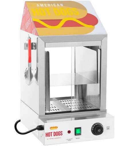 Ob in Restaurants, Hotels, Food Trucks, Kantinen oder Imbissbuden: Der leistungsstarke Hot Dog Steamer RCHW 1000H von Royal Catering, den Experten für professionellen Gastronomiebedarf, kann sowohl Hot Dog Brötchen als auch Würstchen gleichzeitig aufwärmen und optimal temperiert warmhalten. Die Hot Dog Maschine bietet viel Platz, um bis zu 100 Würstchen sowie bis zu 25 Hot Dog Brötchen gleichzeitig schonend mit Wasserdampf aufzuwärmen bzw. warmzuhalten. Brötchen und Würstchen beliebiger Größe lassen sich im Hot Dog Gerät platzsparend unterbringen. Die mitgelieferte Greifzange dient dabei als ideales Werkzeug zur Entnahme heißer Speisen und kann an einer praktischen Halterung am Gerät selbst verstaut werden. Dank seines 1.000 W starken Heizelements erreicht der Hot Dog Wärmer schnell seine optimale Betriebstemperatur. Das Gerät lässt sich mit nur einem Knopfdruck an- und ausschalten. Der beleuchtete Druckknopf zeigt stets an, ob der Würstchenwärmer in Betrieb ist. Mit dem Drehregler legen Sie die gewünschte Temperatur im Bereich zwischen 30 und 110 °C fest. Der eingebaute Thermostat hält die Zieltemperatur konstant aufrecht. Der Bockwurstwärmer besteht aus hochwertigem Edelstahl und bietet dadurch eine hohe Stabilität und Langlebigkeit. Zudem ist pflegeleichter Edelstahl das ideale Material für die Gastronomie, da er besonders resistent gegenüber biologischen Reaktionen und somit hygienisch ist. Zur einfachen Reinigung lassen sich der Einlegeboden wie auch die beiden Schiebetüren aus gehärtetem Glas entfernen. Eine Kontrolllampe zeigt an, wenn der Wasserstand für den Betrieb einmal zu niedrig sein sollte. Zu viel Wasser kann über das praktische Ablassventil entsorgt werden. Rutschfeste Gummifüße verleihen dem Gerät zudem einen sicheren Stand. ...