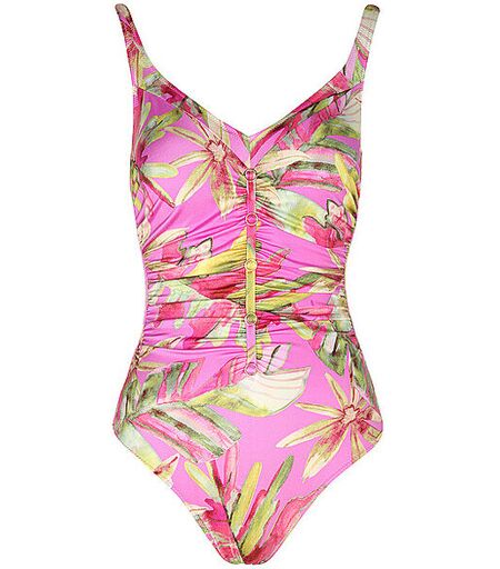 V-Ausschnitt Wattierte Cups Ohne Bügel Ohne seitliche Formstäbchen Elastisches Unterbrustband Tiefer Rückenausschnitt Gemäßigter Beinausschnitt Vollständige Bedeckung des Pos Silberfarbene Logo-Applikationen Allover-Muster Silberfarbene Metalldetails Mit Raffungen Shaping-Effekt: Light Material: 80% Polyamid, 20% Elasthan Farbbezeichnung: Pink ...