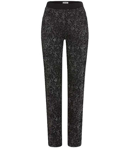Damen Hose aus Baumwoll-Mischung mit Stretch-Anteil Elastischer Bund Allover Ornamentmuster Konischer Beinverlauf Farbbezeichnung: 02 Black Material: 92% Baumwolle, 6% Polyester, 2% Elasthan ...