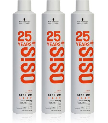Schwarzkopf Professional Osis+ Session, 3x500 ml, Haarpflege Sets für Damen, Das Haarspray Schwarzkopf Professional Osis+ Session sorgt für den letzten Schliff und für einen lang anhaltenden Halt Ihrer Frisur. Es stärkt und fixiert Ihre Frisur für eine lange Zeit, egal wie komplex sie ist, und gewährleistet maximale Kontrolle über Ihr Haar. Sie können sich darauf verlassen, dass jede Haarsträhne an ihrem Platz bleibt und vor äußeren Einflüssen wie Wind und Feuchtigkeit geschützt ist. Das Set beinhaltet: Schwarzkopf Professional Osis+ Session Haarspray mit extra starkem Halt 3 St. Eigenschaften: fixiert gründlich alle Haartypen und Frisuren hinterlässt keine Reste im Haar und lässt sich leicht auskämmen schützt das Haar vor Hitzeschäden für einen extra starken Halt Anwendung: Sprühen Sie das Produkt aus einer Entfernung von 20–30 cm auf die trockenen Haare. ...