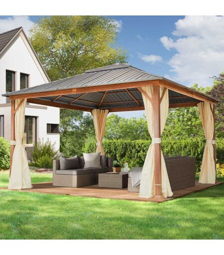 4x4 m Hardtop Gartenpavillon, inkl. 4 Seitenteile, champagnerfarben: Sie möchten Ihre heimische grüne Oase mit einem praktischen Gartenpavillon aufhübschen? Der TOOLPORT Gartenpavillon der Linie Forest in champagnerfarben mit den Maßen 4x4m erfüllt viele Wünsche. Die stabilen Aluminiumpfosten in natürlicher Holzoptik im 90 mm Vierkantprofil sind pflegeleicht, vollständig korrosions- und witterungsbeständig. Das hochwertige Dach aus galvanisierter Stahl gilt als robust. Unsere vielfältigen Modelle inkludieren 4 Seitenteile und ein doppelläufiges Schienensystem – ideal für den perfekten Sicht-, Wind- und Regenschutz. Schaffen Sie mit unseren Faltpavillons maximale Gemütlichkeit! Dieser 4x4m große TOOLPORT Gartenpavillon der Produktline Forest ist etwas ganz Besonderes: Er schmiegt sich in Ihre Gartenidylle ein und wird eins mit der Natur. Sein Design und seine Optik sind einfach unverkennbar. Vom Weiten werden Sie denken, dass dieser Gartenpavillon, aus dem wohl natürlichsten Rohstoff überhaupt bestünde: Holz. Tatsächlich wirkt die Konstruktion dieses Gartenpavillons vollkommen natürlich und authentisch. Holz verleiht Ihnen ein absolutes Naturgefühl, doch ist das Material äußerst pflegebedürftig und auf Dauer nicht witterungsbeständig. Damit Sie nicht regelmäßig streichen, schleifen und lackieren müssen aber dennoch vom ultimativen Naturgefühl profitieren, weist dieser TOOLPORT Gartenpavillon eine täuschend echte Holzoptik auf. Das bedeutet: Sie profitieren von der Qualität von Metall und von der Optik von Holz. Die Pfosten dieses Forest Gartenpavillons bestehen aus pulverbeschichtetem Aluminium und sind somit äußerst stabil. Auch ist die Konstruktion korrosionsgeschützt, sowie UV- und witterungsbeständig. Dank der Holzoptik-Verkleidung wirken die Pfosten zudem völlig naturbelassen. Im Zusammenspiel mit der täuschend echten Holzoptik der Aluminium-Pfosten wird das Dach zum absoluten Blickfang. Dieses ist zu 100 % wasserdicht und schafft einen entspannten, wetterfesten Wohlfühlorten in Ihrem Garten oder auf der Terrasse. Speziell besteht das Dach aus ca. 0,5 mm starkem galvanisierter Stahl. Hinzu kommen die luxuriösen Seitenteile in der Farbe champagnerfarben. Diese lassen sich im Handumdrehen an der Gardinenstange bzw. Gardinenschiene befestigen und sind komplett per Reißverschluss verschließbar. Entscheiden Sie ganz individuell, ob Sie diesen Gartenpavillon mit einer Grundfläche von ca. 16m² offen, halboffen oder geschlossen wünschen. Schließen Sie die Seitenteile, bieten diese einen Regen-, sowie Windschutz. Apropos Regen: Die Gartenpavillon-Seitenteile sind aus hochwertigem, ca. 0,5 mm schwerem galvanisierter Stahl gefertigt und zu 100 % wasserdicht. Sie setzen den Gartenpavillon aber nicht nur gekonnt in Szene und wirken einladend, sondern: Sie stahlen auch eine gewisse Gemütlichkeit aus. So entsteht eine naturbelassene und vollkommene Harmonie zwischen Konstruktion und Natur. Ein Gartenpavillon, der mit seiner Holzoptik mit der Natur und Ihrer... ...