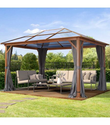 3x4 m Hardtop Gartenpavillon, inkl. 4 Seitenteile, loft grey: Sie möchten Ihre heimische grüne Oase mit einem praktischen Gartenpavillon aufhübschen? Der TOOLPORT Gartenpavillon der Linie Forest in loft grey mit den Maßen 3x4m erfüllt viele Wünsche. Die stabilen Aluminiumpfosten in natürlicher Holzoptik im 90 mm Vierkantprofil sind pflegeleicht, vollständig korrosions- und witterungsbeständig. Das hochwertige Dach aus Polycarbonat-Platten gilt als robust. Unsere vielfältigen Modelle inkludieren 4 Seitenteile und ein doppelläufiges Schienensystem – ideal für den perfekten Sicht-, Wind- und Regenschutz. Schaffen Sie mit unseren Faltpavillons maximale Gemütlichkeit! Dieser 3x4m große TOOLPORT Gartenpavillon der Produktline Forest ist etwas ganz Besonderes: Er schmiegt sich in Ihre Gartenidylle ein und wird eins mit der Natur. Sein Design und seine Optik sind einfach unverkennbar. Vom Weiten werden Sie denken, dass dieser Gartenpavillon, aus dem wohl natürlichsten Rohstoff überhaupt bestünde: Holz. Tatsächlich wirkt die Konstruktion dieses Gartenpavillons vollkommen natürlich und authentisch. Holz verleiht Ihnen ein absolutes Naturgefühl, doch ist das Material äußerst pflegebedürftig und auf Dauer nicht witterungsbeständig. Damit Sie nicht regelmäßig streichen, schleifen und lackieren müssen aber dennoch vom ultimativen Naturgefühl profitieren, weist dieser TOOLPORT Gartenpavillon eine täuschend echte Holzoptik auf. Das bedeutet: Sie profitieren von der Qualität von Metall und von der Optik von Holz. Die Pfosten dieses Forest Gartenpavillons bestehen aus pulverbeschichtetem Aluminium und sind somit äußerst stabil. Auch ist die Konstruktion korrosionsgeschützt, sowie UV- und witterungsbeständig. Dank der Holzoptik-Verkleidung wirken die Pfosten zudem völlig naturbelassen. Im Zusammenspiel mit der täuschend echten Holzoptik der Aluminium-Pfosten wird das Dach zum absoluten Blickfang. Dieses ist zu 100 % wasserdicht und schafft einen entspannten, wetterfesten Wohlfühlorten in Ihrem Garten oder auf der Terrasse. Speziell besteht das Dach aus ca. 8 mm starkem Polycarbonat-Platten. Hinzu kommen die luxuriösen Seitenteile in der Farbe loft grey. Diese lassen sich im Handumdrehen an der Gardinenstange bzw. Gardinenschiene befestigen und sind komplett per Reißverschluss verschließbar. Entscheiden Sie ganz individuell, ob Sie diesen Gartenpavillon mit einer Grundfläche von ca. 12m² offen, halboffen oder geschlossen wünschen. Schließen Sie die Seitenteile, bieten diese einen Regen-, sowie Windschutz. Apropos Regen: Die Gartenpavillon-Seitenteile sind aus hochwertigem, ca. 8 mm schwerem Polycarbonat-Platten gefertigt und zu 100 % wasserdicht. Sie setzen den Gartenpavillon aber nicht nur gekonnt in Szene und wirken einladend, sondern: Sie stahlen auch eine gewisse Gemütlichkeit aus. So entsteht eine naturbelassene und vollkommene Harmonie zwischen Konstruktion und Natur. Ein Gartenpavillon, der mit seiner Holzoptik mit der Natur und Ihrer Gartenidylle eins wird,... ...