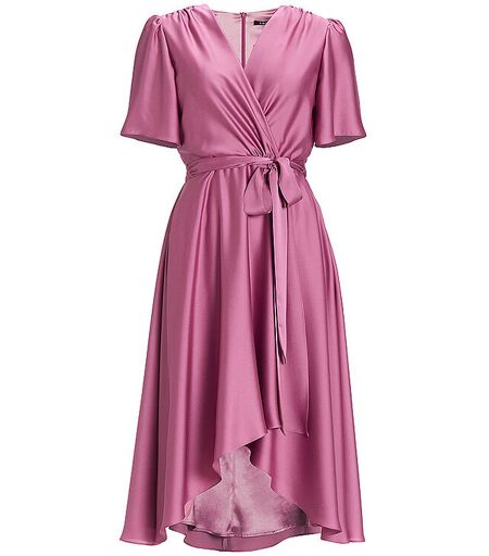 Damen Abendkleid aus Satin In Wickeloptik V-Ausschnitt Kurzarm Bindegürtel Unifarben Midilänge Farbbezeichnung: Raspberry Pink Material: 100% Polyester ...