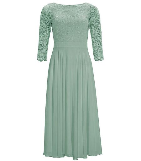 Elegantes Damen-Abendkleid aus fließendem Chiffon mit feiner Struktur Oberteil aus romantischer Spitze U-Boot-Ausschnitt Reißverschluss an der Rückseite 3/4 Ärmel Unifarben Leichtes, glattes Futter Ausgestellter Rockteil Gürtel in schimmernder Satin-Optik an der Mitte Gesamtlänge: ca. 125cm Farbbezeichnung: Soft Green Material: 100% Polyester ...