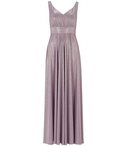 Damen Abendkleid aus foliertem Jersey V-Ausschnitt Tiefer V-Ausschnitt im Rückenteil Schließt mit Reißverschluss Raffung in der Taille Seitlicher Beinschlitz Fließender Fall Unifarben Farbbezeichnung: Mauve Purple Material: 95% Polyester, 5% Elasthan ...