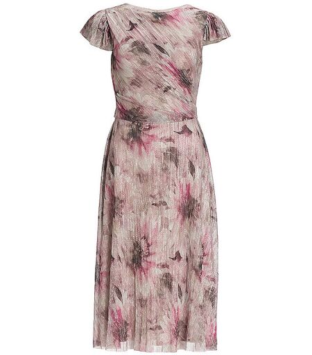 Damen Abendkleid aus bedrucktem Plissee Rundhalsausschnitt Kurze Flügelärmel Schließt mit Reißverschluss in der hinteren Mitte Midi-Länge Länge: Ca: 118 cm Farbbezeichnung: Raspberry Pink / Multi Material: 55% Polyester, 45% Metall ...