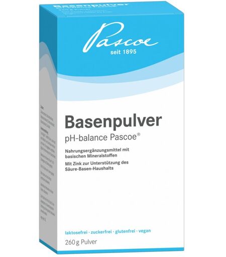 Anwendungsgebiet von Basenpulver PascoeBasenpulver Pascoe dient als Nahrungsergänzung zur Unterstützung und Regulierung eines ausgewogenen Säure-Basen-Haushalts. Körperliche und seelische Belastungen und vor allem eine falsche Ernährung können zu einer Übersäuerung des Körpers führen. Die Folgen sind u.a. Müdigkeit, erhöhte Stressanfälligkeit und eine nachlassende Konzentrationsfähigkeit. Basenpulver Pascoe gewährleistet die ausreichende Zufuhr an basischen Mineralstoffen und lässt die Symptome einer Übersäuerung erst gar nicht entstehen.Wirkungsweise von Basenpulver PascoeDas Kohlensäure-Bicarbonat-Puffer System ist der wichtigste Regulator unseres Blut-pH-Wertes. Verschiedene Faktoren, langfristig aber vor allem eine falsche und einseitige Ernährung, können das System nachhaltig stören und den Blut-pH-Wert erniedrigen (pH-Wert kleiner 7). Basenpulver Pascoe sorgt nun seinerseits für eine ausreichende Zufuhr an basischen Vitalstoffen und verhindert so den Abbau körpereigener Basendepots. Basenpulver Pascoe besitzt eine hohe Säure-Bindungskapazität.