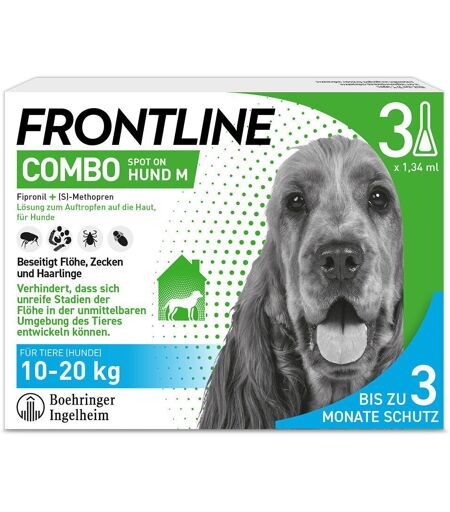 FRONTLINE COMBO® - gegen Zecken, Flöhe und Haarlinge bei Hunden. Hemmt auch die Entwicklung von Floheiern, Flohlarven und Flohpuppen in der Umgebung. Ein Parasitenbefall ist schnell in die eigenen vier Wände getragen und kann durch übertragbare Krankheiten für Hunde sogar gefährlich werden. Mit FRONTLINE COMBO® schützen Sie Ihren Hund zuverlässig gegen Parasiten wie Zecken, Flöhe und Haarlinge. Zusätzlich zu einem Schutz auf dem Tier hemmt FRONTLINE COMBO® auch den Befall der direkten häuslichen Umgebung des Tieres durch Floheier, Flohlarven und Flohpuppen. Einfach im Nacken auf der Haut des Hundes aufgetragen, verteilt sich die wasserfeste und geruchslose Lösung mit dem natürlichen Talgfilm über die gesamte Körperoberfläche des Tieres und wirkt so effektiv gegen Parasiten auf dem Tier. Die Kombination aus zwei Wirkstoffen verhindert dabei gleichzeitig, dass sich Floheier, -larven und -puppen in der Umgebung entwickeln können. So begleitet FRONTLINE COMBO® Hunde auf all ihren Abenteuern wie ein unsichtbarer Schutzmantel. Vertrauen Sie auf die Nr. 1 gegen Zecken und Flöhe bei Hunden und Katzen* – mit bewiesener Wirksamkeit und sehr guter Verträglichkeit für unsere Vierbeiner. Die Anwendung von FRONTLINE COMBO® Entnehmen Sie eine Pipette aus der Verpackung. Halten Sie die Pipette aufrecht und knicken Sie die Pipettenspitze an der perforierten Stelle nach unten ab. Das Fell des Hundes zwischen den Schulterblättern scheiteln und die Pipette direkt auf die Haut aufsetzen. Dann die Pipette entleeren. Von dieser Stelle aus verteilt sich der Wirkstoff innerhalb von 1 bis 2 Tagen mit dem natürlichen Talgfilm auf der gesamten Haut. Die Wirkweise von FRONTLINE COMBO® FRONTLINE COMBO® ist der Kombischutz für Tier und Heim. Nach dem Auftragen auf die Haut des Hundes verteilt sich das Produkt mit dem natürlichen Talgfilm der Haut und wirkt so wie ein äußerer, unsichtbarer Schutzmantel gegen Zecken, Flöhe und Haarlinge. Für eine optimale Verteilung sollte das Tier innerhalb von 2 Tagen nach der Anwendung nicht gebadet werden. Danach ist FRONTLINE COMBO® – wie alle FRONTLINE®-Produkte – wasserfest. Die Parasiten nehmen den Wirkstoff bei Kontakt mit Fell und Haut auf und werden so innerhalb weniger Tage unschädlich gemacht. Gleichzeitig wird die Entwicklung von neuen Floheiern, -larven und -puppen auf dem Tier und in der direkten Umgebung des Tieres gehemmt. DIE HÄUFIGSTEN FRAGEN RUND UM FRONTLINE COMBO® Wie schützt FRONTLINE COMBO® mein Tier und mein Zuhause? FRONTLINE COMBO® besitzt eine Wirkstoffkombination, die bei regelmäßiger Anwendung sowohl das Tier gegen verschiedene Parasitenarten schützt, als auch den Befall der direkten häuslichen Umgebung des Tieres mit Floheiern, -larven und -puppen hemmt. Während einer der Wirkstoffe gegen Zecken, Flöhe und Haarlinge auf dem Tier wirkt und vor einem erneuten Befall schützt, verhindert der zweite enthaltene Wirkstoff, dass sich Floheier, - larven und -puppen in der direkten Umgebung des... ...