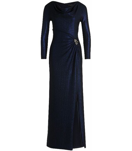 Elegantes Damen Abendkleid aus Jersey mit Glitzereffekt Wasserfallausschnitt Langarm Schließt mit Reißverschluss Raffung im Vorderteil Langer Schlitz Figrubetonte Passform Gesamtlänge: Ca. 154 cm Länge ab Taille: 112 cm Farbbezeichnung: Dark Blue / Dark Blue Material: 95% Polyester, 5% Elasthan ...