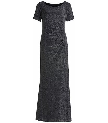 Elegantes Damen Abendkleid aus Jersey Carmen-Ausschnitt Kurzarm Schließt mit Reißverschluss in der hinteren Mitte Raffung in der Seite Figurbetonte Passform Gesamtlänge: Ca. 154 cm Länge ab Taille: 112 cm Farbbezeichnung: Dark Blue / Silver Material: 87% Polyamid, 9% Polyester, 4% Elasthan ...