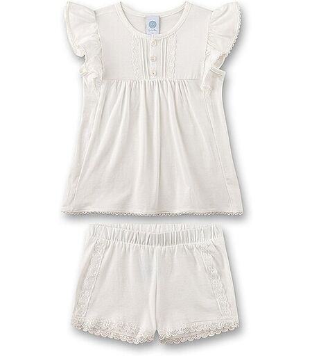 Mädchen Pyjama aus Modal-Jersey Oberteil mit Rundhalsausschnitt Volantärmel Knopf und Spitzen Detail auf der Brust Gerade geschnitten Elastische Schlupfhose Seitlich und am Saumende mit Spitzenbodüren Unifarben Kurze Länge Farbbezeichnung: White Pebb Material: 94% Modal, 6% Elasthan ...