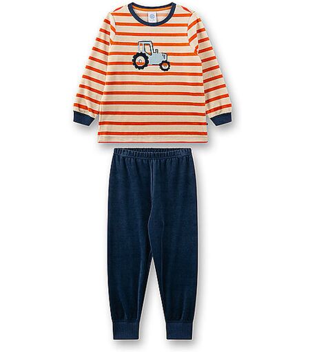 Baby Pyjama aus weichem Nicki Gewebe Rundhalsausschnitt Langarm Ringelmuster Traktormotiv auf der Vorderseite Hose mit bequemen Bund Farbbezeichnung: Desert Sun Material: 80% Baumwolle 20% Polyester ...