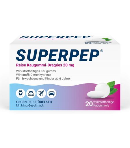 Apothekenpflichtiges Arzneimittel gegen Übelkeit und Erbrechenaus der Gruppe der H1-Antihistaminika. Zur Prophylaxe und symptomatischen Therapie von Übelkeit und Erbrechen bei leichten Fällen der Reisekrankheit. Reiseübelkeit – Konflikt verschiedener Sinneseindrücke: Manche Menschen bemerken die typischen Symptome der Reiseübelkeit bereits bei kurzen Autofahrten. Andere erwischt es, wenn der Bus schlingert und auf hoher See leiden fast alle Landratten unter Reiseübelkeit. Reiseübelkeit ist eigentlich keine Krankheit, sondern ein physiologische Reaktion auf verschiedene Sinneseindrücke im Gehirn. Wenn die Ursache von ungewohnten Bewegungen nicht ständig mit den Augen verfolgt werden kann, kann das Gehirn diese Reize im Gleichgewichtsorgan im Innenohr nicht zuordnen. Das Ergebnis der Reizung des Gleichgewichtsorgans ist eine Aktivierung des Brechzentrums und weitere vegetative Reaktionen. SUPERPEP® Reise Kaugummi-Dragées: Wer unter Reiseübelkeit leidet, dem können SUPERPEP® Reise Kaugummi-Dragées helfen. Ihr Wirkstoff Dimenhydrinat hebt kompetitiv Wirkungen von Histamin an H1.Rezeptoren auf. Übelkeit und Schwindel gehen spürbar zurück und ein Erbrechen kann verhindert werden. Aufgrund der praktischen Darreichungsform, dem Kaugummi-Dragée, können SUPERPEP® Reise Kaugummi-Dragées vorbeugend zu Hause eingenommen werden, oder erst unterwegs bei Bedarf. Für Erwachsene und Kinder geeignet: Im Vergleich zu Dimenhydrinat-Tabletten wird man von SUPERPEP® Reise Kaugummi-Dragées nicht so müde. Wegen ihrer geringen Dosierung und aufgrund ihrer bequemen Darreichungsform, den Kaugummi-Dragées, eignen sich SUPERPEP® Reise Kaugummi-Dragées auch für Kinder ab 6 Jahren. SUPERPEP® Reise Kaugummi-Dragées – das einzige Kaugummi gegen Reiseübelkeit: Vorbeugend und bei Bedarf anwendbar Macht nicht so müde Ideal für unterwegs – ganz ohne Wasser Für Kinder ab 6 Jahren und Erwachsene geeignet Wirkstoff: Dimenhydrinat. Zusammensetzung: 1 Kaugummi-Dragée enthält: Arzneilich wirksamer Bestandteil: 20 mg Dimenhydrinat. Sonstige Bestandteile: Gummibase, Sorbitol, Saccharose, Talkum, Hartfett, Dextrin, Pfefferminz-Aroma, Magnesiumstearat, gebleichtes Wachs, hochdisperses Siliciumdioxid, Levomenthol, leichtes Magnesiumoxid, Aspartam, Methacrylsäure-Methylmethacrylat-Copolymer (1:2) (MW: ca. 135000), Saccharin-Na, Calciumcarbonat, Farbstoff E 171, Macrogol 35000, Glucose-Sirup, Bas. Butylmethacrylat-Copolymer (MW: ca. 150000), Povidon K 25, Montanglycolwachs, Kaliumdihydrogenphosphat. Anwendungsgebiete: Arzneimittel gegen Übelkeit und Erbrechen aus der Gruppe der H1-Antihistaminika. Zur Vorbeugung und Behandlung von Übelkeit und Erbrechen bei leichteren Fällen der Reisekrankheit. Gegenanzeigen:Nicht anwenden bei Überempfindlichkeit gegenüber Dimenhydrinat, anderen Antihistaminika bzw. einem anderen Bestandteil des Arzneimittels, akutem Asthma-Anfall, grünem Star (Engwinkelglaukom), Nebennierentumor (Phäochromozytom), Störung der Produktion des Blutfarbstoffes (Porphyrie),... ...