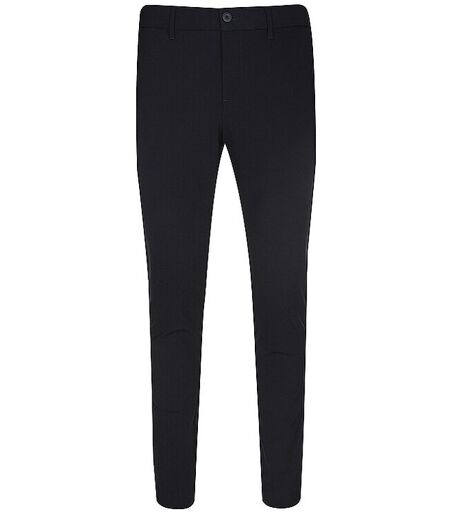 Herren Chino Bund mit elastischem Einsatz Schließt mit Knopf, Gegenknopf und Reißverschluss Mittlere Leibhöhe Seitliche Eingriffstaschen Unifarben Gesäßtaschen Schmaler Beinverlauf Farbbezeichnung: Navy Material: 89% Polyamid 11% Elasthan ...