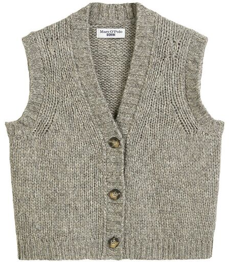 Dies ist die neue, trendige, frische und moderne und ärmellose Version des geliebten Grandpa-Cardigans: das kuschelige Rundhals-Modell aus einem Schurwolle-Alpakawolle-Mix. Die lässige Jacke von Marc O’Polo DENIM hat einen entspannten Fit mit überschnittenen Schultern, einen tiefen, gerippten V-Ausschnitt, edle Knöpfe in Hornoptik sowie klassische Rippbündchen an Ärmeln und Saum. Zu den hochwertigen Verarbeitungs- und Qualitätsmerkmalen zählen französische Schultern, glatt gestrickte Ausschnittblenden und Fully-Fashioned-Details – das heißt, der ärmellose Cardigan ist teilweise in Form gestrickt und kommt so mit weniger Garnabfall aus. Wissenswertes: Alpakawolle ist eine der wärmsten Naturfasern und sorgt für perfekte Isolierung und ein einzigartiges Wärmegefühl. Damen Strickgilet aus kuscheligem Schurwoll-Alpaka-Mix V-Ausschnitt Schließt mit drei Knöpfen Ohne Arm Gerade Passform Unifarben Farbbezeichnung: Stone Melange Material: 60% Schurwolle, 16% Polyamid, 12% Polyacryl, 12% Alpaka Die Marke Marc O`Polo ist Mitglied der Fair Wear Foundation. ...