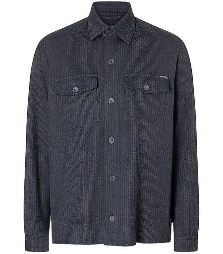 Herren Overshirt aus hochwertigem Viskose-Mix Kragen Langarm Mit Knopfleiste Zwei aufgesetzte Pattentaschen mit Knopfverschluss Nadelstreifen Gerade Passform Farbbezeichnung: Midnight Blue Stripes Material: 63% Polyester, 32% Viskose, 5% Elasthan ...