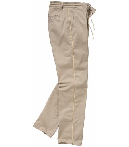 Einer vom Typ Anpacker. Mit den akzentuierenden Paspelnähten beweist die Hose Mut und Selbstbewusstsein. Sie weiß, dass sich kein Fädchen kräuselt und leistet sich einen Galonstreifen in Zitronengelb, der wie ein Spot jede Naht beleuchtet. Jogginghosen-bequem: der elastische Bund mit Gummizug. Der Stoff mit viel luftiger Baumwolle und etwas Elasthan für die Flexibilität kann was ab. Die sanfte Vorwäsche verleiht der Hose Lässigkeit, der Beige-Ton ist entspannter als reines Weiß. Entweder zum schwarzen Hemd oder mit bedrucktem Hemd und Pullover tragen. Perfekt wird es mit dem passenden Sakko (Nr. 24-6498-9). ...