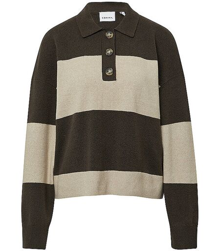Damen Pullover aus weichem Strick Hemdblusenkragen mit Kurze Knopfleiste Langarm Allover Muster Lockere Passform Farbbezeichnung: Brown Material: 52 % Baumwolle, 45 % Polyester, 3 % Elasthan Die Marke Comma ist Mitglied der Fair Wear Foundation. ...