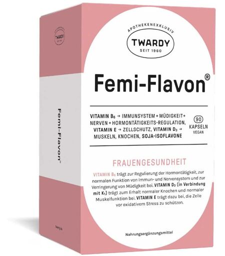 Anwendungsgebiet von Femi-Flavon KapselnFemi-Flavon Kapseln sind ein Nahrungsergänzungsmittel mit Soja-Isoflavonen und Vitaminen.Wirkstoffe / Inhaltsstoffe / ZutatenZutaten von Femi-Flavon Kapseln: Isoflavonreiches Sojabohnenkonzentrat (30,6%), Sojaöle und -fette (teilweise gehärtet), Gelatine, Feuchthaltemittel: Glycerin Vitamin E (all-rac-α-Tocopherylacetat), Feuchthaltemittel: Sorbit Vitamin B6 (Pyridoxinhydrochlorid), Vitamin D (Cholecalciferol), Vitamin K (Phytomenadion), Stabilisator: Bienenwachs gelb Emulgator: Sojalecithin Farbstoffe: Eisenoxid gelb, Titandioxid. Die empfohlene Tagesdosis von Femi-Flavon® Kapseln (1 Kapsel) enthält: Zusammensetzung Tagesdosis % der empfohlenen (1 Kapsel) Tagesdosis* Sojabohnenkonzentrat 150 mg - entspr. Soja-Isoflavone 60 mg - Vitamin E 20 mg α-TE 167 Vitamin B6 1,4 mg 100 Vitamin K 75 μg 100 Vitamin D 5 μg 100 * Referenzmenge nach EU-Lebensmittelinformations-VerordnungGegenanzeigenBei bekannter Überempfindlichkeit gegenüber einem der oben genannten Inhaltsstoffe sollte dieses Produkt nicht angewendet werden.DosierungVerzehrempfehlung von Femi-Flavon Kapseln: 1 x täglich 1 Kapsel mit ausreichend Flüssigkeit unzerkaut schlucken.HinweiseNahrungsergänzungsmittel sind kein Ersatz für eine abwechslungsreiche und ausgewogene Ernährung sowie eine gesunde Lebensweise. Nahrungsergänzungsmittel außerhalb der Reichweite von kleinen Kindern lagern. Die angegebene empfohlene tägliche Verzehrsmenge darf nicht überschritten werden. Femi-Flavon Kapseln können in Ihrer Versandapotheke www.juvalis.de erworben werden. ...