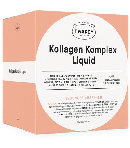 Wirkstoffe / Inhaltsstoffe / ZutatenKollagen Komplex Liquid Ampullen enthält:Zutaten: Wasser, Kollagen-Peptide (Fisch) (10%), Ananassaftkonzentrat, Fruktose, Vitamin C (L-Ascorbinsäure), Zinkgluconat, Vitamin E (DL-_-Tocopherylacetat), Kupfergluconat, DBiotin, Mangosaftkonzentrat, Orangensaftkonzentrat, Passionsfruchtkonzentrat, Säuerungsmittel: Zitronensäure Konservierungsstoff: Kaliumsorbat Verdickungsmittel: Xanthan natürliches Aroma, Süßungsmittel: Sucralose.Gluten- und laktosefreiZusammensetzungTagesdosis (1 Trinkampulle)% der empfohlenen Tagesdosis*Kollagen-Peptide (vom Fisch)2,5 g/Vitamin C80 mg100Vitamin E6 mg α-TE50Zink5 mg50Kupfer150 µg15Biotin50 µg100*Nährstoffbezugswerte: Referenzmenge für die tägliche Zufuhr gemäß LebensmittelinformationsverordnungMit Zucker und Süßungsmittel. Exotisch-fruchtiger Geschmack.Brennwert: 20 kcal (85 kJ)/Trinkampulle. Broteinheiten (BE): 0,18/Trinkampulle.GegenanzeigenBei bekannter Überempfindlichkeit gegenüber einem der oben genannten Inhaltsstoffe sollte dieses Produkt nicht angewendet werden.DosierungAnwendungsempfehlung von Kollagen Komplex Liquid Ampullen:Täglich den Inhalt einer verzehrfertigen Ampulle à 25 ml trinken.Vor dem Verzehr gut schütteln. Geeignet für die dauerhafte Einnahme.Brennwert: 20 kcal (85 kJ)/Trinkampulle. Broteinheiten (BE): 0,18/Trinkampulle.HinweiseDie empfohlene tägliche Verzehrmenge darf nicht überschritten werden. Nahrungsergänzungsmittel sollten nicht als Ersatz für eine abwechslungsreiche und ausgewogene Ernährung sowie eine gesunde Lebensweise dienen. Außerhalb der Reichweite von kleinen Kindern aufbewahren. Bei Raumtemperatur, trocken und vor Licht geschützt aufbewahren. Kollagen Komplex Liquid Ampullen können in Ihrer Versandapotheke www.juvalis.de erworben werden. ...