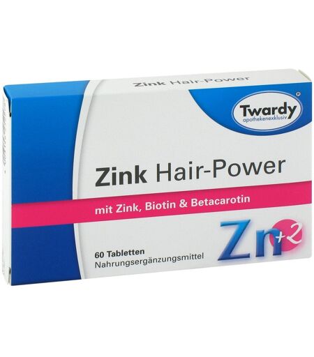 Anwendungsgebiet von Zink Hair-power TablettenZink Hair-power Tabletten sind ein Nahrungsergänzungsmittel mit Zink, Biotin und Betacarotin. Zink und Biotin tragen zur Aufrechterhaltung normaler Haare bei. Betacarotin wird im Körper, bedarfsabhängig in Vitamin A umgewandelt. Vitamin A trägt zur Erhaltung normaler Haut bei.Wirkstoffe / Inhaltsstoffe / ZutatenZutaten von Zink Hair-power Tabletten: Füllstoff: Calciumphosphat Feuchthaltemittel: Sorbit Überzugsmittel: Hydroxypropylmethylcellulose Füllstoff: mikro- kristalline Cellulose Zink (Zinkcitrat), Betacarotin, Biotin (D-Biotin), Füllstoff: Reisstärke Trennmittel: Magnesiumsalze der Speisefett- säuren, Polyethylenglycol, Polyvinylpyrrolidon, Talkum Emulgator: Zuckerester von Speisefettsäuren Farbstoff: Eisenoxid. Gluten- und laktosefrei. Die empfohlene Tagesdosis von Zink Hair-Power (1 Tablette) enthält: Zusammensetzung Tagesdosis % der empfohlenen (1 Tablette) Tagesdosis* Zink 5 mg 50 Betacarotin 3 mg - (entspr. Vitamin A 500 μg RE 62,5) Biotin 180 μg 360 * Referenzmenge nach EU-LebensmitelinformationsverordnungGegenanzeigenBei bekannter Überempfindlichkeit gegenüber einem der oben genannten Inhaltsstoffe sollte dieses Produkt nicht angewendet werden. DosierungVerzehrempfehlung von Zink Hair-power Tabletten: 3 x täglich 1 Kapsel mit reichlich Flüssigkeit zu den Mahlzeiten schlucken.HinweiseNahrungsergänzungsmittel sind kein Ersatz für eine abwechslungsreiche und ausgewogene Ernährung sowie eine gesunde Lebensweise. Nahrungsergänzungsmittel außerhalb der Reichweite von kleinen Kindern lagern. Die angegebene empfohlene tägliche Verzehrsmenge darf nicht überschritten werden. Zink Hair-power Tabletten können in Ihrer Versandapotheke www.juvalis.de erworben werden. ...