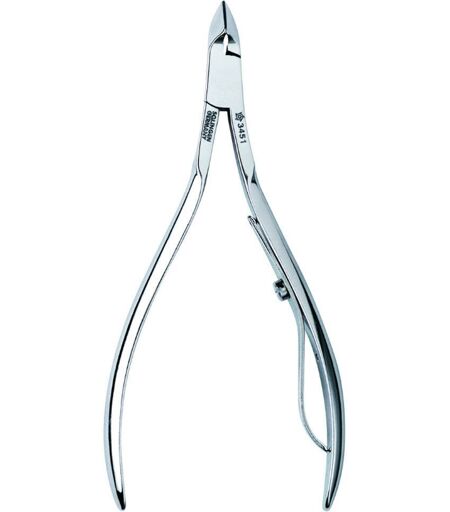 Hautzange aufgelegt, lange Schneide, N, 95 mm. Pfeilring Hautzange. Beidhändig einsetzbar. Zum exakten Schneiden der feinen Nagelhaut. Gleichmäßig gehärtete Zangenschenkel, von Hand aufeinander optimal abgestimmt. Die Feder öffnet die Zange automatisch nach dem Schneiden, deshalb diese vor Gebrauch nach oben drehen, bis sie arretiert. ...