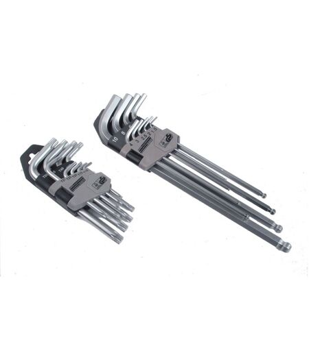 MANNESMANN Winkelschraubendrehersatz (18-tlg.) Dieser 18-teilige Winkelschraubendrehersatz bestehend aus einem Stiftschlüsselsatz 9-tlg. und einem T-Profilschlüsselsatz 9-tlg. ist ideal geeignet für Schraubarbeiten aller Art. Eigenschaften: Stiftschlüsselgrößen: 1,5 - 2 - 2,5 - 3 - 4 - 5 - 6 - 8 - 10mm T-Profilschlüsselgrößen: T10 - T15 - T20 - T25 - T27 - T30 - T40 - T45 - T50 Inhalt: 2 Satz in Halter ...