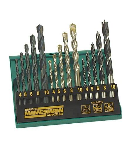 MANNESMANN Kombi-Bohrersatz Holz-, Stein- und HSS-Bohrer 15-teilig gefräste Spannuten Steinbohrer mit eingelöteter HM-Platte aus Wolframcarbid Holzbohrer mit Zentrierspitze je Ø 4-5-6-8-10 mm ...