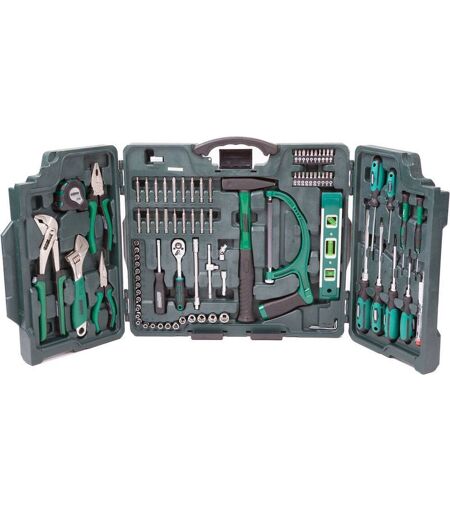 Dieses 89-teilige Werkzeugset von Brüder Mannensmann besteht aus ergonomisch geformten Handwerkzeugen in verschiedenen Größen und eignet sich für eine Vielzahl von Heimwerker- und Reparaturarbeiten in Haus, Werkstatt und Garage. Es ist ideal für sowohl Profis als auch Hobbyisten. Da das Set aus professionellem, wärmebehandeltem Chrom-Vanadium-Stahl gefertigt ist, ist es sehr robust und langlebig. Es ist außerdem leicht zu transportieren und nimmt in seinem robusten Tragekoffer nur wenig Platz ein. Im Lieferumfang sind 89 Werkzeuge enthalten (Zange, Kombizange, Spitzzange, Schraubenschlüssel, Schraubendreher, Präzisionsschraubendreher, Spannungsprüfer, Schlosserhammer, Wasserwaage, Maßband, Bügelsäge, Ersatz-Sägeblätter, gebogene Sechskantschlüssel, Ratschen-Steckschlüssel, Multi-Bit-Schraubendreher, Kreuzgelenk, Verlängerung, flexible Verlängerung, Quergriff mit Gleitstück, Bit-Adapter, Aufsätze, Bits). ...