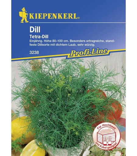 Kiepenkerl Dill Tetra Anethum graveolens var. hortorum, Inhalt: ca. 200 Pflanzen Produktnummer: 0693105732 Besonders ertragreiche und standfeste Dillsorte mit dichtem Laub. Die Pflanzen riechen und schmecken besonders aromatisch. Dazu sind sie auch sehr dekorativ. Die pflanzen können auch in Hochbeeten und größeren Kübeln gepflanzt werden. Die junge Blätter, Triebspitzen, halbreife Dolden und Samen werden getrocknet oder frisch zu Suppen, Soßen, Gemüse, Salaten und zum Einlegen von Gurken genommen. Aussaat Vorkultur: März, April, Mai Direktsaat: Mai, Juni, Juli, August Inhalt: ca. 200 Pflanzen Lebensdauer: einjährig Botanische Bezeichnung: Anethum graveolens var. hortorum Deutscher Name: Dill Blütenfarbe: gelb Erntezeit: Juni, Juli, August, September, Oktober max. Pflanzenhöhe: 80 - 100 cm Nahrungsquelle für Bienen und Nützlinge: nein Standort: sonnig Standortbeschreibung: Nach der Aussaat andrücken und feucht halten. Liebt nährstoffreichen Boden und sonnige Lagen.Günstige Nachbarschaft: Bohnen, Erbsen, Gurken, Möhren, Salat, Rote Beete, Zwiebeln. Loses Saatgut Winterhart: nein Gewicht (Netto): 9 g ...