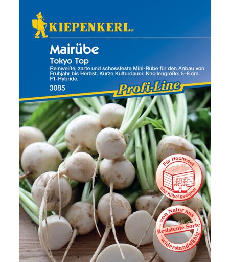 Kiepenkerl Mairübe Tokyo Top F1 Produktnummer: 0693109666 Mit ihrem süßen Geschmack und toller Qualität überzeugt die reinweiße Profi-Line Mairübe 'Tokyo Top'. Die kompakte Pflanze mit dem kräftigen Laub ist schossfest und von Natur aus sehr widerstandsfähig. Dies zeigt sich auch in der Resistenz der anbausicheren F1-Hybride gegen die Fusarium-Welke. Die Kultivierung kann von Frühjahr bis Herbst im Freiland durchgeführt werden. Doch auch das Gewächshaus, Hoch- und Frühbeet eignen sich ausgezeichnet dafür. Dank ihrer kurzen Kulturdauer bietet sich die Mairübe als Folgesaat an, bei der lediglich auf die Fruchtfolge geachtet werden muss. Genutzt werden sollten Flächen, die zuvor nicht mit anderen Kreuzblütlern bepflanzt und auch nicht mit der Kohlhernie befallen waren. Idealerweise werden die zarten, glatten Mini-Rüben zwischen Mai und Oktober bei einer Größe von 5-8 cm geerntet. Anschließend können Sie die 'Tokyo Top' wunderbar gedünstet zubereiten, doch auch der Frischverzehr ist ein wahrer Geheimtipp. Pflanzzeit: April, Mai, Juni, Juli, August Standort: sonnig Erntezeit: Mai, Juni, Juli, August, September, Oktober zum Verzehr geeignet Lebensdauer: einjährig Keimdauer: 7 - 14 Tage optimale Keimtemperatur: 15 - 20 °C Pflanzabstand: 20 cm Pflanztiefe: 0 - 0,5 cm Fruchtlänge: 0 - 5 cm hoher Ertrag (F1): ja Botanischer Name: Brassica rapa Winterhart: nein Inhalt reicht für ca. 200 Pflanzen ...