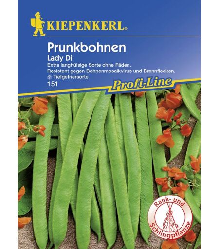 Kiepenkerl Profi-Line Prunkbohnen Lady Di Phaseolus coccineus, Inhalt: 8-10 Stangen Produktnummer: 0693107825 Extra langhülsige Sorte ohne Fäden. Resistent gegen Bohnenmosaikvirus und Brennflecken. Eine extra langhülsige, dunkelrotblühende, fadenlose Prunkbohne. Diese Spitzensorte hat mittel- bis dunkelgrüne, wohlschmeckende Hülsen, die 2 cm breit und 30 cm lang werden. Eine recht ertragreiche Sorte. Direktsaat: Mai, Juni Inhalt: 8-10 Stangen Lebensdauer: einjährig Botanische Bezeichnung: Phaseolus coccineus Deutscher Name: Prunkbohne Blütenfarbe: dunkelrot Erntezeit: Juli, August, September Standort: sonnig - halbschattig Standortbeschreibung: Lockerer Boden in sonniger Lage.Bodenverbesserungsmaßnahmen: Die Bohnen verwerten auf Grund bestimmter Knöllchenbakterien an den Wurzeln den Stickstoff der Luft, darum ist nur eine geringe Nährstoffzufuhr notwendig. Im Herbst oder im zeitigen Frühjahr gut verrotteten Kompost oder ein entsprechend organisches Produkt mit Gesteinsmehl in den Boden leicht einarbeiten. Loses Saatgut Winterhart: nein gefriergeeignet Gewicht (Netto): 55 g ...