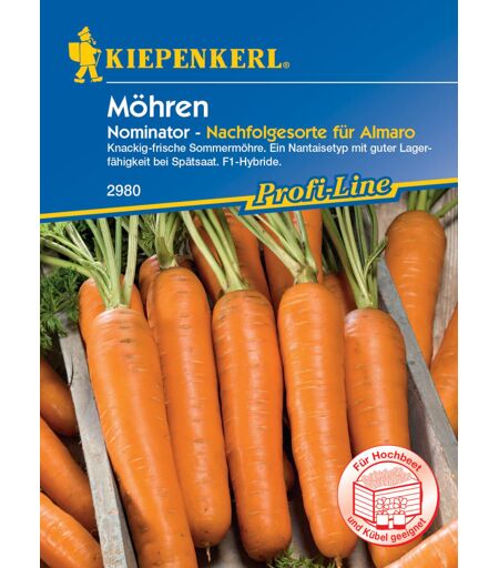 Kiepenkerl Möhre Nominator F1 Produktnummer: 0693109273 Erfreuen Sie sich besonders schnell an frischem Gemüse: Die Möhre 'Nominator' der Profi-Line ist eine schnellwachsende, knackig-frische Sommermöhre, die früh abstumpft. Im Sommer ist sie eine absolute Bereicherung für jeden Gemüsesalat! Diese F1-Hybridsorte vom Nantaisetyp entwickelt sehr gleichmäßige Möhren von 16-20 cm Länge und hat eine geringe Neigung zur Grünköpfigkeit. 'Nominator' passt sich in der Aussaat Ihren Vorlieben an: Ob im Frühbeet und unter Glas oder später im Jahr - die Sorte eignet sich sowohl für den frühen Anbau als auch für eine späte Aussaat. Bei Spätsaat können die Möhren ausgesprochen gut gelagert werden. Die Sorte 'Nominator' ist eine Nachfolgesorte von 'Almaro'. Pflanzzeit: März, April, Mai, Juni, Juli Standort: halbschattig, sonnig Erntezeit: Juli, August, September zum Verzehr geeignet Lebensdauer: einjährig Keimdauer: 7 - 14 Tage optimale Keimtemperatur: 10 - 20 °C Pflanzabstand: 30 cm Pflanztiefe: 1 - 1,5 cm Fruchtlänge: 15 - 20 cm hoher Ertrag (F1): ja Botanischer Name: Daucus carota Winterhart: nein Inhalt reicht für ca. 5 lfd. Meter ...