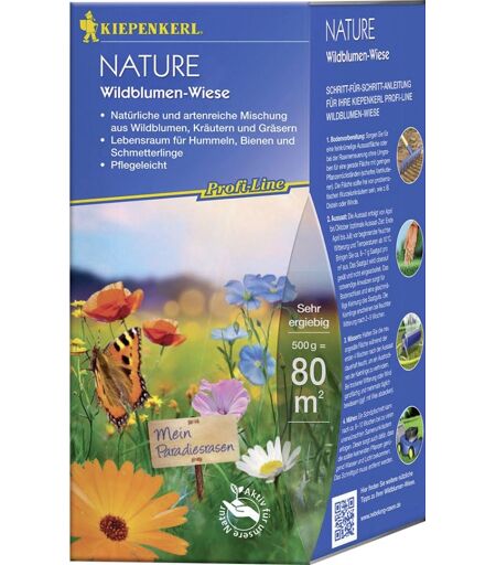 Kiepenkerl Saatgut Wildblumen-Wiese ca. 80 qm Produktnummer: 0693107790 Profi - Line Nature. Natürliche und artenreiche Mischung aus Wildblumen, Kräutern und Gräsern. Lebensraum für Hummeln, Bienen und Schmetterlinge. Pflegeleicht. Geringe Aufwandmenge: nur 6-7 g/m². Reicht für ca. 80 m². Aussaat: März - August Winterhart: ja ...