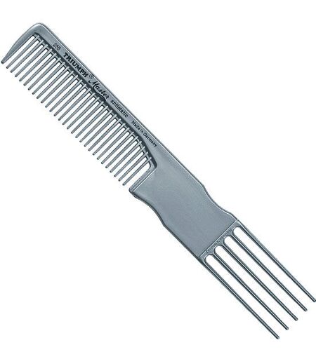 7½", grobe Zahnung. Kunststoffkämme werden in einem Arbeitsgang in ihre endgültige Form gegossen. Die Qualität und die Eigenschaften eines Kammes werden durch die Güte des Formwerkzeuges und den verwendeten Kunststoff bestimmt. Alle Kunststoffkämme der Marke Triumph werden in hochwertigen Formwerkzeugen gefertigt und sind dadurch frei von groben, haarschädigenden Graten. Die verwendeten Kunststoffe Polycarbonat und Polyoximethylen (POM) bedienen die Anforderungen des preisbewussten Friseurs an ein hochwertiges Arbeitsgerät perfekt. Das verwendete Polycarbonat ist außerordentlich schlagzäh. Auf den Punkt gebracht: Kämme aus Polycarbonat sind kaum kleinzukriegen. Der für die Nadelstielkämme verwendete Kunststoff Polyoximethylen (abgekürzt POM) zeichnet sich darüber hinaus durch exzellente Federeigenschaften aus. Beide Werkstoffe zeichnen sich durch eine optimale Dimensionsstabilität sowie eine hervorragende Beständigkeit gegen die meisten Chemikalien wie sie im Friseuralltag vorkommen aus. ...