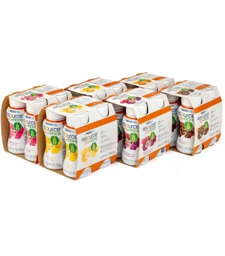 Nahrungsergänzungsmittel sind kein Ersatz für eine ausgewogene und abwechslungsreiche Ernährung und eine gesunde Lebensweise.resource® 2.0 + fibre Mischkarton Hochkalorische Trinknahrung mit Ballaststoffen Aufbaukost bei MangelernährungGenießen Sie die Vielfalt mit dem resource® 2.0 + fibre Mischkarton – die hochkalorische Trinknahrung mit löslichen Ballaststoffen zum Diätmanagement bei bestehender Mangelernährung oder bei Risiko für eine Mangelernährung. Der Mischkarton enthält insgesamt 24 Flaschen in verschiedenen Geschmacksrichtungen, jede liefert 400 kcal, 18 g Eiweiß und allen wichtigen Vitaminen und Mineralstoffen. Der resource® 2.0 + fibre Mischkarton eignet sich besonders gut für Patient:innen mit einem erhöhten Bedarf an Energie und Nährstoffen, beispielsweise bei krankheits- oder altersbedingter Mangelernährung.Im Mischkarton finden Sie folgende Sorten:• 8 Flaschen Vanille• 4 Flaschen Erdbeere• 4 Flaschen Aprikose• 4 Flaschen Multifrucht• 4 Flaschen Kaffee Diese Trinknahrung eignet sich sowohl zur ergänzenden als auch zur ausschließlichen Ernährung und enthält lösliche Ballaststoffe.Jede Sorte des resource® 2.0 + fibre Mischkartons schmeckt gekühlt am besten und kann leicht in den Alltag integriert werden. Lagern Sie das Produkt kühl und trocken, und schütteln Sie es gut vor dem Verzehr.Häufige Fragen:Wie viele Flaschen resource® 2.0 + fibre sollte ich pro Tag trinken?Zur ergänzenden Ernährung sind täglich 1 – 3 Flaschen resource® 2.0 + fibre zusätzlich zu Ihrer normalen Ernährung empfohlen. Achten Sie jedoch bitte darauf, die Dauer der Anwendung und Menge von resource® Trinknahrung - insbesondere bei ausschließlicher Ernährung - immer mit Ihrem Arzt zu besprechen.Wie nehme ich resource® Trinknahrungen zu mir?Für den besten Genuss empfehlen wir, resource® 2.0 + fibre gekühlt zu trinken. Bitte schütteln Sie die Flasche vor dem Trinken gut durch. Die geöffnete Flasche wiederverschließen, im Kühlschrank aufbewahren und innerhalb von 24 Stunden verzehren.Für wen ist resource® 2.0 + fibre geeignet?resource® 2.0 + fibre ist geeignet ab 3 Jahren und für Personen mit Mangelernährung, ungewolltem Gewichtsverlust und/oder erhöhtem Energiebedarf, wie etwa bei chronischen/konsumierenden Erkrankungen, nach Operationen oder bei altersbedingten Esstörungen. Die löslichen Ballaststoffe unterstützen eine normale Darmflora.Kann ich resource® Trinknahrungen mit anderen Getränken oder Lebensmitteln mischen?Ja, Sie können resource® 2.0 + fibre ganz nach Ihrem Geschmack mit anderen Getränken/Speisen mischen oder auch in Rezepten verarbeiten, z.B. als Soße zum Dessertgericht oder im (Eis-)Kaffee als Milchersatz.Kann ich resource® Trinknahrungen erhitzen?resource® 2.0 + fibre kann bedenkenlos bis maximal 40 °C erwärmt werden.Kann resource® 2.0 + fibre vom Arzt verordnet werden?Ja, resource® 2.0 + fibre Trinknahrung kann bei bestehender Mangelernährung oder bei Risiko für eine Mangelernährung zu Lasten der gesetzlichen Krankenkasse vom Arzt verordnet... ...
