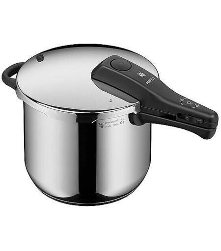 Perfekte Ergebnisse im Handumdrehen: Der WMF Schnelltopf Perfect 6,5l / 22cm ist wie gemacht für die Zubereitung vielseitiger Gerichte voller Geschmack sowie voller natürlicher Vitamine, Nähr- und Mineralstoffe in kürzester Zeit. Schmoren, Glasieren, Dünsten, Dämpfen: Das intuitive Kochsignal mit zwei Kochstufen ermöglicht eine komfortable, schnelle Zubereitung von zartem Gemüse, Fisch und Geflügel bis hin zu deftigem Fleisch, Kartoffeln und Eintöpfen. Dieser klassische Schnellkochtopf ist ganz leicht zu öffnen und zu schließen. Dafür sorgt ein seitlicher Schieber an dem mit einem Klick abnehmbaren Griff, der sich mühelos, hygienisch reinigen lässt. Gefertigt aus hochwertigem, spülmaschinengeeignetem Cromargan®: Edelstahl Rostfrei 18/10 punktet der WMF Schnelltopf Perfect auf allen Herdplatten mit optimaler Wärmeverteilung. Sein mehrstufiges Sicherheitssystem mit stufenweiser Abdampffunktion sorgt dabei für unbesorgtes Schnellkochen in jeder Küche. ...