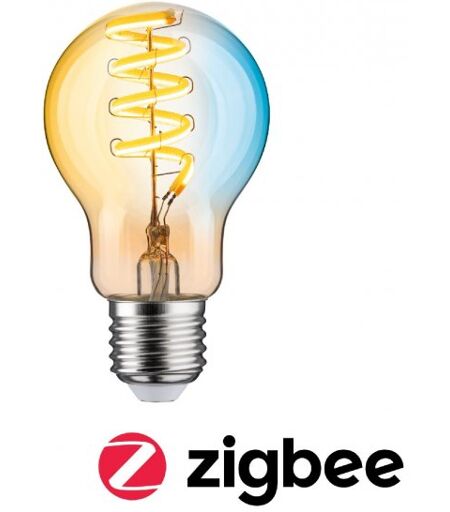 Paulmann Filament 230V Smart Home Zigbee 3.0 LED Birne E27 600lm 7,5W Tunable White dimmbar Gold Das Zigbee 3.0 Filament-Leuchtmittel mit 600lm überzeugt mit einem Vintage-Design und einem angenehmen, gleichmäßigen Licht. über die Tunable White Funktion lässt sich die Lichtfarbe nach Bedarf einstellen: von tageslichtweißem Arbeitslicht bis hin zu warmweißer Entspannungsbeleuchtung. Die Lampe lässt sich einfach und komfortabel per App, Fernbedienung oder Sprachbefehl einzeln oder innerhalb einer Gruppe steuern. So kannst du jederzeit die passende Lichtstimmung für dein Zuhause wählen. Dabei passt das Leuchtmittel in jede handelsübliche E27 Fassung. Klassisch schön Moderne LED Technik Raumlicht rundum Dimmbar Tunable White bietet eine stufenlose Auswahl von Warmweiß bis hin zu Tageslichtweiß Dimmbar technische Produktdetails Abmessung (Höhe x Breite x Tiefe): H: 110 mm Durchmesser: 60 mm Inklusive Leuchtmittel: ? Spannung: 230 V Stromstärke: 49 mA Farbe: Gold Material: Glas Scheinleistung: 9,5 VA Bauform: Standardform Farbtemperatur Bereich: 2.200 - 5.500 K Dimmbar: Ja Verwendbar mit folgenden Dimmern: Paulmann SmartHome Zigbee Gent 500.67 Dimmen: mit Smart Home#mit Fernbedienung Farbwechsel: Tunable White Technik: LED Lebensdauer: 15.000 h Anzahl Bestückung: 1x Bemessungs-/Nutzlichtstrom: 600 lm Bestückung: 7,5 W Bemessungslebensdauer: 15000 h Bemessungsleistung: 7,5 W Anlaufzeit bis 60% Lichtstrom: 0 s Energieeffizienzklasse (Spektrum A-G): G Energieverbrauch: 8 kWh_1000h Farbkonsistenz: SDCM 6 Farbwiedergabeindex: > 80 Ra Leistungsfaktor: 0,64 Nennlichtstrom (Lumen): 600 lm Lichtstromerhalt am Ende der Nennlebensdauer: 75 % Lichtstromwinkel: 360 ° Schaltzyklen vorzeitiger Ausfall >=: 50000 Sockel/Fassung: E27 Entspricht Glühlampe: 47 W Zündzeit <: 0 s ...