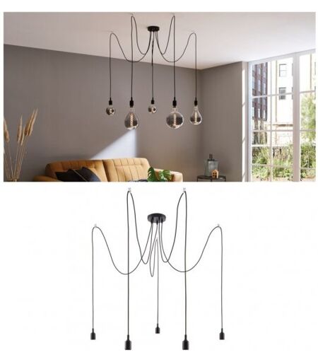 Paulmann Pendelleuchte Neordic Ketil 5-flammig ohne Leuchtmittel, max. 5x20W E27 Die 5-flammige Pendelspinne Ketil macht jede Zimmerdecke zum dekorativen Hingucker. Die Leuchte wird in Einzelteilen geliefert und darf selbst zusammengebaut werden. Die Zeit für den Zusammenbau beträgt etwa 45 Minuten. Mit Hilfe der mitgelieferten Haken, lassen sich die einzelnen Stränge individuell an der Decke befestigen. In Kombination mit Kopfspiegellampen oder Filaments ergeben sich individuelle Lichtszenarien. Produktdetails Pendellänge: 200 cm Lebensdauer: 30.000 h Durchmesser: 150 mm Max. Leistung: max. 5x20 W Stoffkabel: Stoffkabel Zündzeit <: 0.0 s Spannung: 230 V Farbe: Schwarz Technik: Leuchte ohne Leuchtmittel Anzahl Bestückung: 5x Dimmbarkeit: Die Leuchte ist dimmbar, die Dimmbarkeit ist abhängig von der Art der verwendeten Leuchtmittel. Material: Metall, Silikon Sockel/Fassung: E27 ...