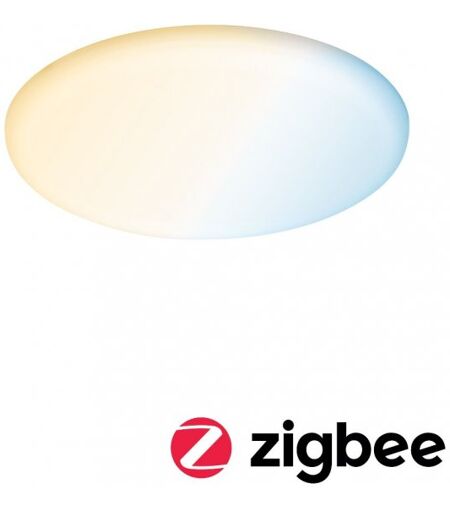 Paulmann Smart Home Zigbee LED Einbaupanel Veluna VariFit Tunable White 215mm IP44 17W Flexibel einsetzbar wie noch nie! Das Einbaupanel Veluna VariFit mit dem Durchmesser von 215mm besticht durch eine absolut randlose und homogene Lichtfläche. Mit einer superschlanken Aufbauhöhe von nur 10 mm verschmelzt das Panel quasi mit der Decke oder der Wand. Durch Spritzwasserschutz für den Einsatz im Badezimmer oder Feuchtraum geeignet. Die satinierte Oberfläche der Diffusorplatte sorgt für angenehm flächiges Raumlicht. Die Klemmfedern für den Einbau sind stufenlos auf jede übliche Einbaulochgröße zwischen 60 und 190 mm einstellbar, das erleichtert den Austausch alten Systeme enorm. Mit der Tunable White Weißlichtsteuerung lässt sich die Lichtfarbe der Leuchte individuell und stufenlos einstellen - von tageslichtweißem Arbeitslicht bis hin zu warmweißer Entspannungsbeleuchtung ist alles möglich. Die Leuchte ist Zigbee 3.0 kompatibel. Zigbee ist ein Funkübertragungsprotokoll, das Geräte verschiedener Hersteller miteinander vernetzt. IP-Schutz: IP44 - spritzwassergeschützt Unsere Zigbee-Produkte können allgemein mit jeder Smart Home Zentrale, die über eine Zigbee Schnittstelle verfügt, genutzt werden steuerbar mit Smart Home Zigbee Fernbedienung mit Weißlichtsteuerung (Tunable White) gleichmäßiges Raumlicht auf Basis modernster LED-Technik besonders flache Bauweise mit integriertem LED-Leuchtmittel Produktdetails Inklusive Leuchtmittel: ? App-steuerbar: App-steuerbar Bidirektionalität: Bidirektionalität Lebensdauer: 30.000 h Nennlichtstrom (Lumen): 1.300 lm Farbwechsel: Tunable White Kompatible Smart Home Technik: ZigBee (Alexa, Lightify u.a.) Funkreichweite: 20 m max. SAR-Wert: 2,38 mW Smart Home: ? Lichtstrom LED-Modul: 1900 lm Einbautiefe (Hohlraum): 60 mm Durchmesser: 215 mm Einbauöffnung 2: 190 mm Hohlraumtiefe: 60-95 mm Einbautiefe: 75-110 mm Abmessung (Höhe x Breite x Tiefe): H: 10´´31 mm Zündzeit 80 Ra Entspricht Glühlampe: 120 W Montageort Empfehlung: Wand- und Deckenmontage aufgenommene Leistung: 21 W IP Schutz: IP44 Deckenmontage Dimmbarkeit: Ja Dimmen: mit Smart Home Material: Kunststoff Spannung: 230 V ...