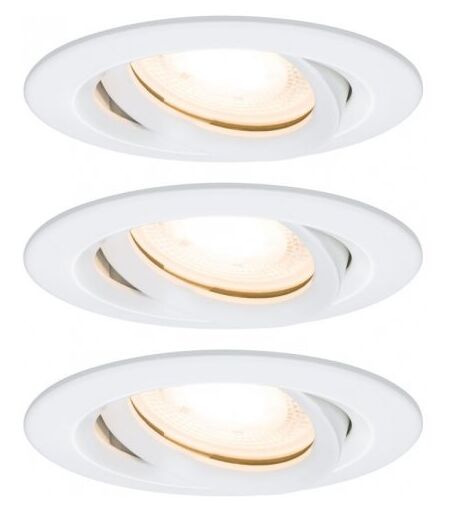 Paulmann LED Einbauleuchte Nova Plus Basisset schwenkbar IP65 rund 93mm 30° GU10 3x7W 3x460lm 230V dimmbar 2700K Weiß matt Paulmann Nova Einbaustrahler 3x7W aus Alu Zink in Weiß matt, bieten Ihnen gutes Licht, stimmiges Design und hohe Energieeffizienz. Die puristische Optik wird nicht von Sprengringen gestört: Da das Leuchtmittel von hinten eingesetzt wird ist kein Sprengring notwendig. Dank 230V-Direktanschluss, können Sie die Leuchten ganz einfach uneingeschränkt miteinander verketten. Durch die unkomplizierte Fixierung mit Haltefedern, bleibt die Zimmerdecke auch nach mehrmaligem Ein- und Ausbau unbeschädigt. Im Lieferumfang sind effiziente und langlebige GU10 LED-Leuchtmittel enthalten, die mit ihrem warmweißen Licht für ein stimmungsvolles Ambiente sorgen. Set aus 3 Leuchten mit schwenkbaren Spots zur optimalen Ausleuchtung inkl. auswechselbarem LED Leuchtmittel Farbtemperatur: 2700K - Warmweiß einfaches Einsetzen des Leuchtmittels ohne Sprengring IP-Schutz: IP65 – strahlwassergeschützt für den 230V-Direktanschluss Produktdetails Abmessungen Hohlraumtiefe 75 mm Einbautiefe 90 mm Durchmesser 93 mm Einbauöffnung 83 mm Form rund Mindest-Hohlraumtiefe 75 mm Design und Material Rostfrei Rostfrei Alu Farbe Weiß matt Material Alu Zink Energieverbrauch Energieeffizienzklasse (Spektrum A-G) G Lebensdauer Lebensdauer 15.000 h Lichteigenschaften Farbtemperatur 2700 K Ausstrahlwinkel 36 ° Nennlichtstrom (Lumen) 460 lm Farbtemperatur Bereich 2.700 K Farbkonsistenz SDCM 6 Farbwiedergabeindex > 80 Ra Lampeneigenschaften Bestückung 7 W Schwenkbereich 30 ° Technik LED Sockel/Fassung Coin IP Schutz IP65 Deckenmontage Dimmbar mit Dimmer R+C f.elektr.Trafo+230V Lampen Inklusive Leuchtmittel ? Max. Leistung 3x35 W Anzahl Bestückung 3x Schutzklasse Schutzklasse II ...