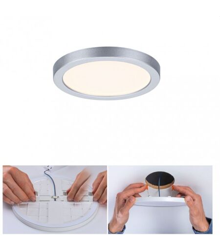 Paulmann LED Einbaupanel Areo VariFit IP44 rund 118mm 6,5W 3.000K Chrom matt Das runde Einbaupanel Areo mit einem Durchmesser von 118 mm und einer Leistung von 6,5 Watt in Chrom matt sorgt für flächiges warmweißes Licht. Dank flexibler VariFit-Technik lassen Sie sich Klemmfedern für den Einbau stufenlos zwischen 50 und 85 mm einstellen. Damit kann das Panel sowohl in bereits vorhandene Bohrlöcher als auch in neue mit Standard Bohrkrone eingebaut werden. VariFit - flexibler Einbau mit stufenlos verstellbaren Klemmfedern mit integriertem LED-Leuchtmittel aus pflegeleichtem Kunststoff Farbtemperatur: 3000K - Warmweiß Für den 230V-Direktanschluss IP-Schutz: IP44 - spritzwassergeschützt Produktdetails Nennlichtstrom (Lumen): 550 lm Einbautiefe (Hohlraum): 30 mm Lebensdauer: 30.000 h Durchmesser: 118 mm Einbauöffnung 2: 85 mm Lichtstrom LED-Modul: 850 lm Farbtemperatur Bereich: 3.000 K Entspricht Glühlampe: 65 W Einbautiefe: 45-70 mm Abmessung (Höhe x Breite x Tiefe): H: 12'བ mm Hohlraumtiefe: 30-55 mm Zündzeit 80 Ra Anzahl Bestückung: 1x Scheinleistung: 14 VA Watt: 6,5 W Farbe: Chrom matt Technik: LED Einbauöffnung: 50 mm Schutzklasse: Schutzklasse II IP Schutz: IP44 aufgenommene Leistung: 8 W Spannung: 230 V Material: Kunststoff Dimmbarkeit: Nein ...