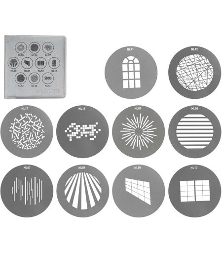 Nanlite Gobo-Set AS-GB-FZ60-SET1 Zur Projektion von einzigartigen Mustern und Texturen auf den Hintergrund oder das Aufnahmemotiv Bestehend aus 10 verschiedenen Metall-Gobos (Schattenmasken) Zur Verwendung in den Projektionsvorsätzen PJ-FZ60-19 und PJ-FZ60-36 in Verbindung mit den Reportage- und Studio-Scheinwerfern Forza 60 und Forza 60B. Außendurchmesser: 78 mm Motivdurchmesser: 60 mm ...
