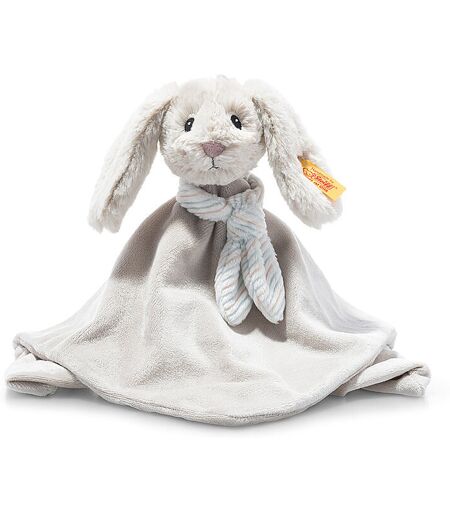 Das 26 cm große Soft Cuddly Friends My first Steiff Hoppie Hase Schmusetuch aus Plüsch für babysanfte Haut fühlt sich herrlich weich an: die langen Ohren, der runde Hasenkopf mit den gestickten Augen, Nase und Mund, das kleine gestreifte Halstuch... Und natürlich das hellgraue Schmusetuch selbst, das mit einer „My first Steiff“ Stickerei versehen ist. Dank der Fingerpuppenfunktion können Größere den Kleinsten ihre Lieblingsgeschichten mit der ideenreichen, unternehmungslustigen Hoppie Hase vorspielen und eigene Abenteuer im Land der Kuschelfreunde dazuerfinden. Der Artikel passt zur Steiff tonies® Serie, ist aber ohne Chip! Farbbezeichnung: Hellgrau Material: 100% Polyester Hinweis: Der Artikel wird derzeit umgestellt und kann bei Auslieferung bereits eine ecru-dunkelgraue Ohrfahne statt der bekannten gelb-roten tragen. ...