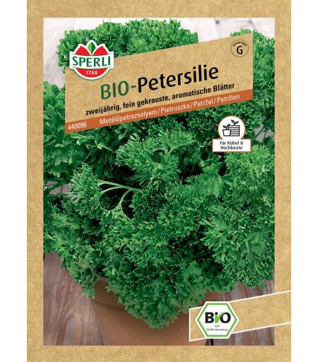 Sperli BIO Petersilie kraus Produktnummer: 0693109709 Bei der zweijährigen Petersilie handelt es sich um eine recht winterharten Pflanzen mit fein gekrauste, dicht gefüllte Blätter, die Du mehrfach ernten kannst. Die 20 - 30 cm hohen Pflanzen können gut in Töpfen kultiviert werden. Ideal zum Würzen und Verfeinern von Suppen, Soßen und Salaten geeignet. Grüne Perle kann, je nach Standort, ganzjährig geerntet, frisch verwendet oder eingefroren werden. Petersilie liebt einen lockeren, tiefgründigen Boden, der nicht frisch gedüngt wurde. Ab April ins Freiland verpflanzen. Pflanzzeit Direktsamen: März, April, Mai, Juni, Juli, August Pflanzzeit Vorkultur: Januar, Februar, März, April, Mai, Juni, Juli, Oktober, November, Dezember Standort: halbschattig, sonnig Erntezeit: Juni, Juli, August, September, Oktober Zum Verzehr geeignet Lebensdauer: zweijährig Keimdauer: 14 - 21 Tage optimale Keimtemperatur: 15°C - 20°C Pflanztiefe: 0,5 - 1 cm Wuchshöhe: 20 - 30 cm hoher Ertrag (F1): nein Botanischer Name: Petroselinum crispum Winterhart: bedingt Inhalt reicht für ca. 350 Pflanzen ...