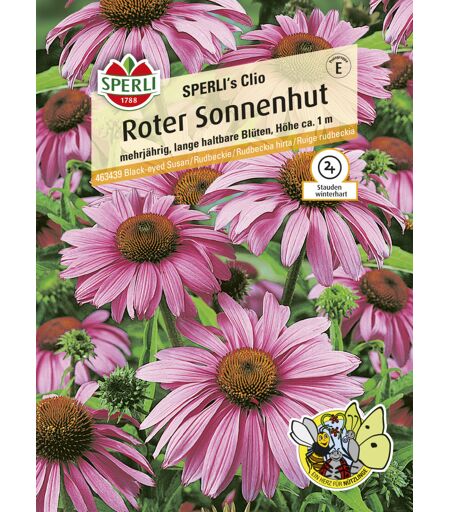 Sperli Roter Sonnenhut SPERLI's Clio Produktnummer: 0693108148 SPERLI's Clio ist eine genügsame, trockenverträgliche Schnittstaude, die im Spätsommer und Frühherbst 8 - 10 cm große, purpurne, haltbare Blütenköpfe auf steifen, wenig verzweigten Stengeln trägt. Pflanzzeit Direktsaat: April, Mai, Juni Pflanzzeit Vorkultur: März, April Standort: halbschattig, sonnig Blütezeit: Juli, August, September Lebensdauer: mehrjährig Blütenfarbe: pink Keimdauer: 14 - 21 Tage Kulturdauer: 56 Wochen optimale Keimtemperatur: 15 - 20 °C Pflanzabstand: 50 cm Pflanztiefe: 0,5 - 1 cm Wuchshöhe: 100 cm Botanischer Name: Echinacea purpurea Inhalt reicht für ca. 25 Pflanzen ...